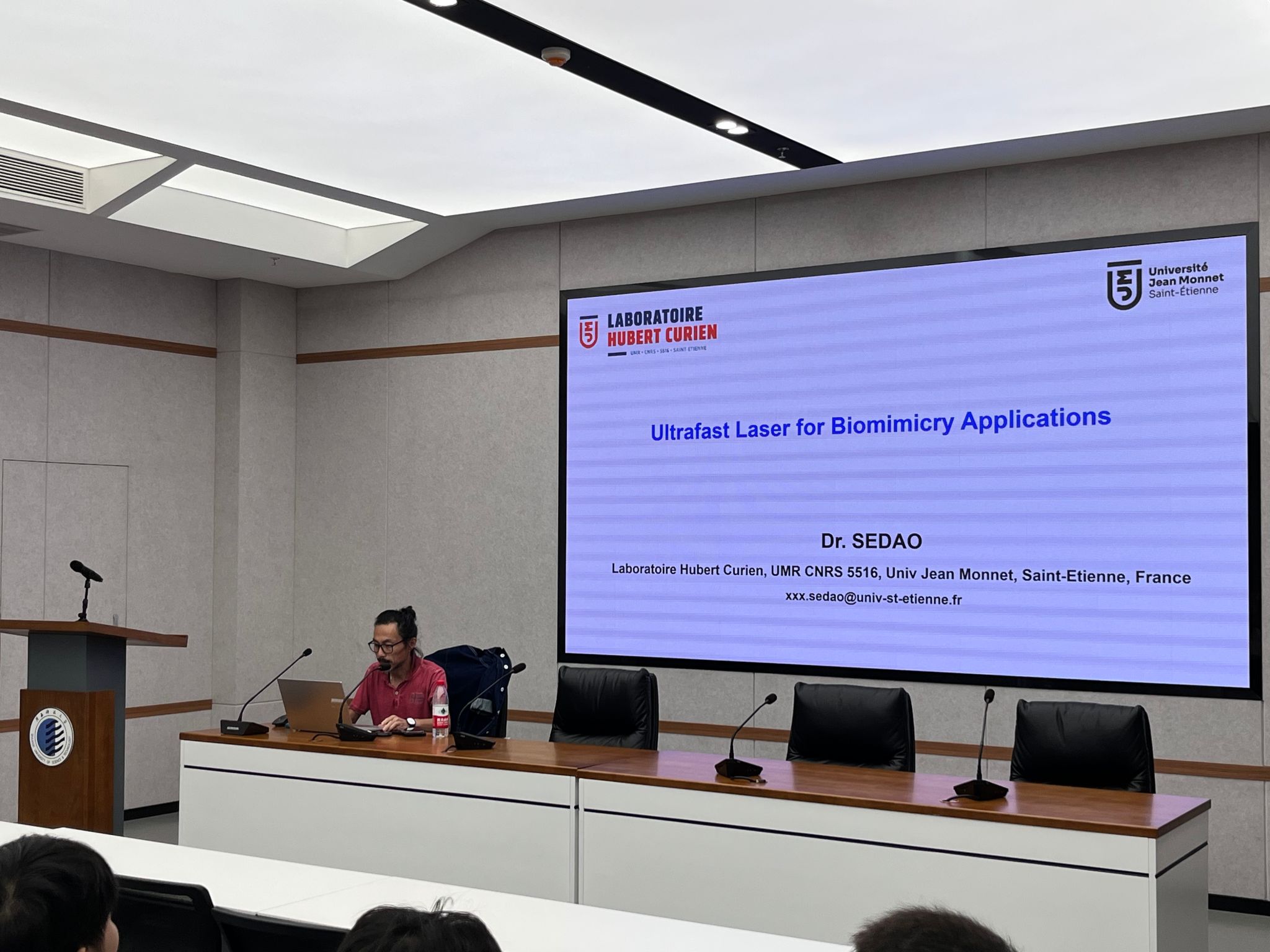 9月1日的報告中,SEDAO教授以“Ultrafast Laser Processing: Applications Overview”為題,系統講解了超高速激光脈沖與材料的相互作用機制、表面功能化技術及工業化應用路線,解析了核心技術原理與落地路徑,并結合增材制造、生物醫學等實例,展現了超快激光的廣泛應用潛力。3日,他以“Ultrafast Laser for Biomimicry Applications”為題,圍繞仿生學展開,闡述了仿生學理念,介紹了自然啟發表面的功能特性及超快激光紋理化技術,還解析了眼科生物源材料中激光與材料的相互作用等內容。5日的“Pulsed-Laser for Direct Coloration of Metals”報告,闡述了激光與物質相互作用原理、金屬表面顏色呈現(含結構色與色素色的區別)及相關加工工藝,通過光捕獲黑色表面等實例體現了應用價值。每場報告中,教授都與師生深入交流,解答技術難點,引導多學科交叉思考,幫助師生了解前沿動態,對提升學校相關領域國際化交流層次意義重大。
